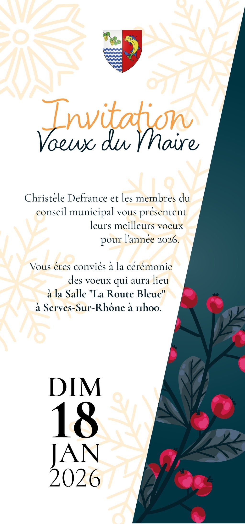 Vous êtes conviés à la cérémonie des voeux qui se tiendra à la salle "La Route Bleue" le dimanche 18 janvier à 11 h 00.
